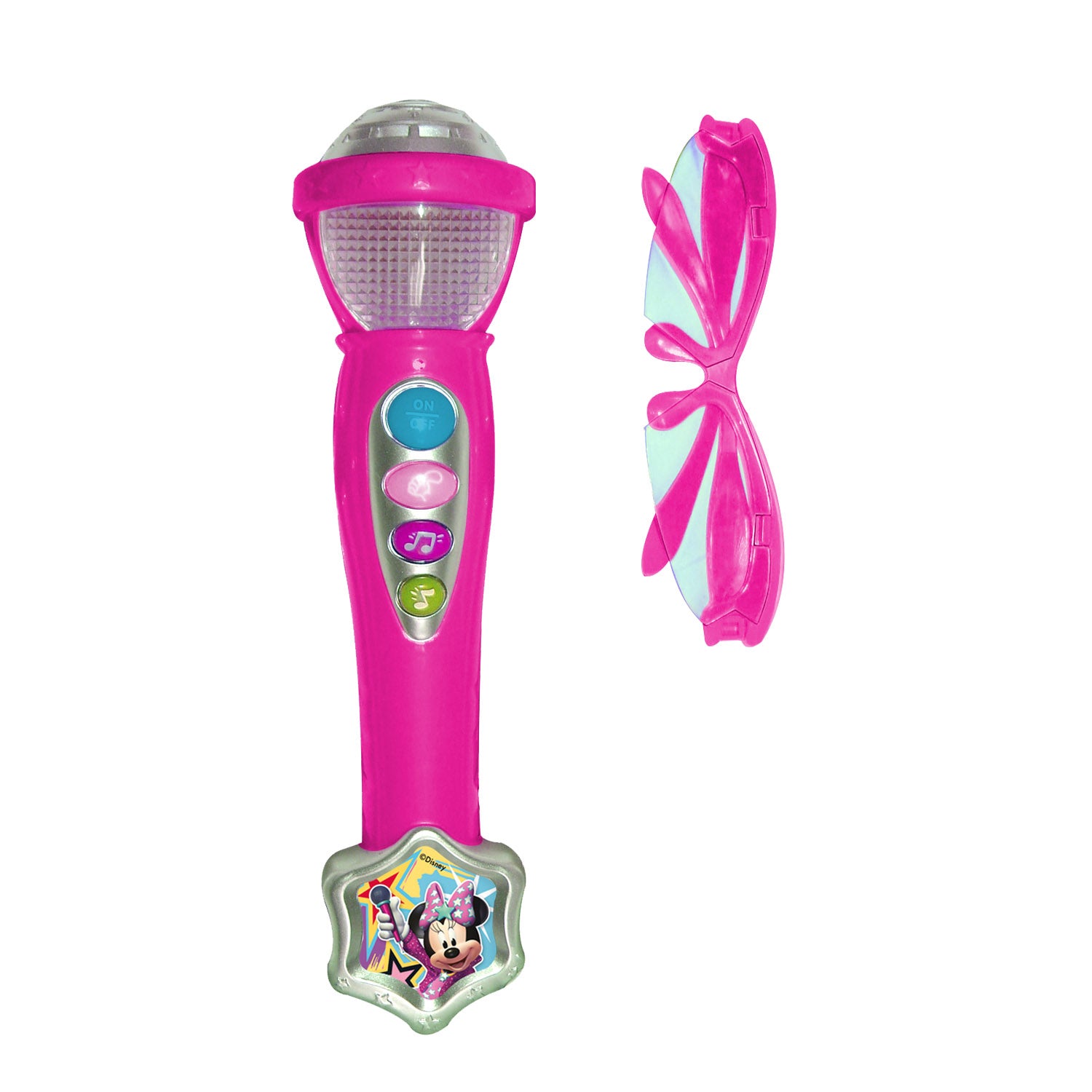 Completa el estilo con los hermosos lentes que incluye este set karaoke de minnie y prepárate para recibir muchos aplausos del público.
